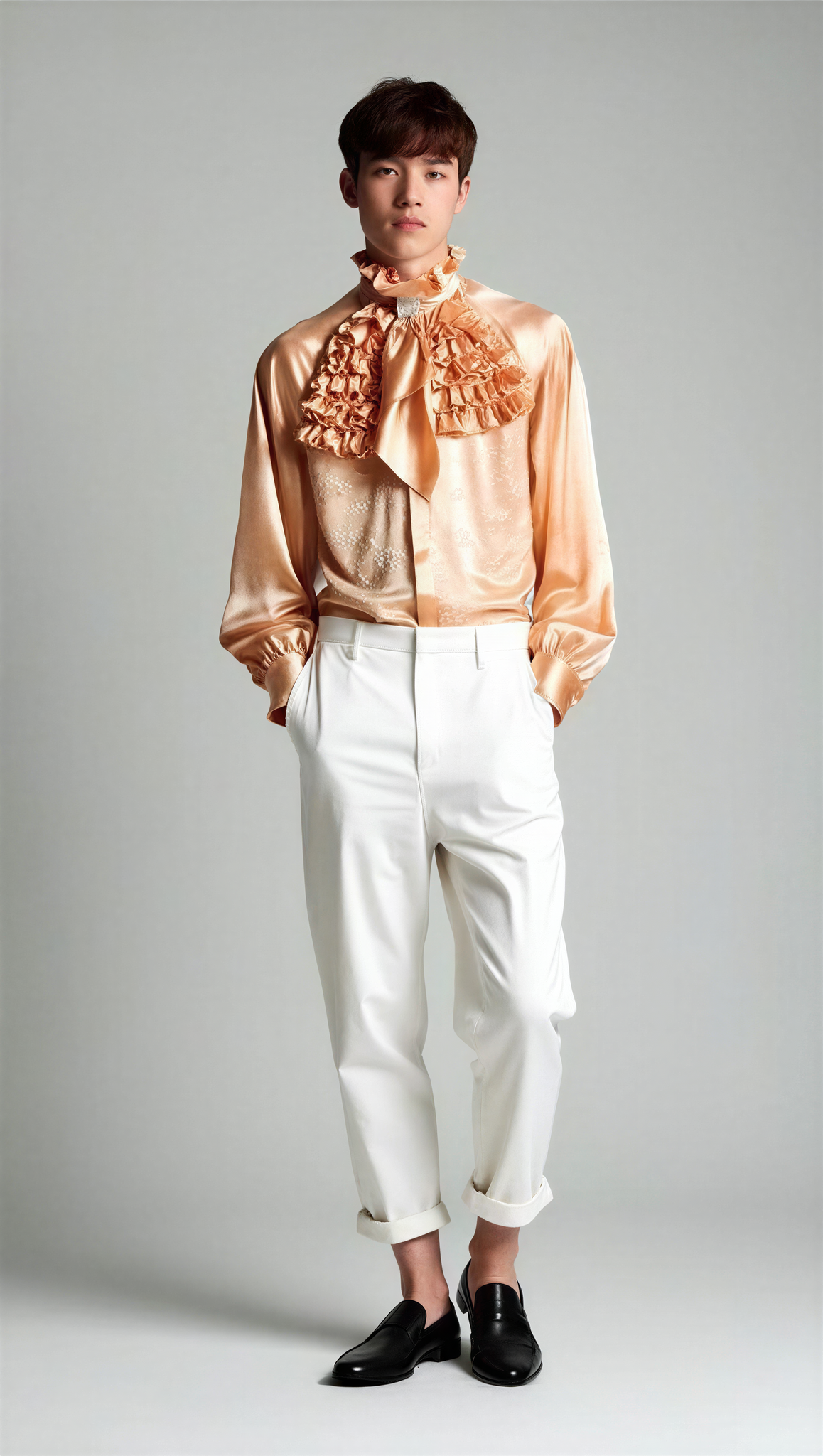 Men's dress shirt with hidden button and banded ruffles collar with one cover button. Has plastic buttons, shaped hem and detachable neck. Ruffles cuff style. Extravagant Prom Shirt. Excellent for performers, theatre, singers, dancers.....